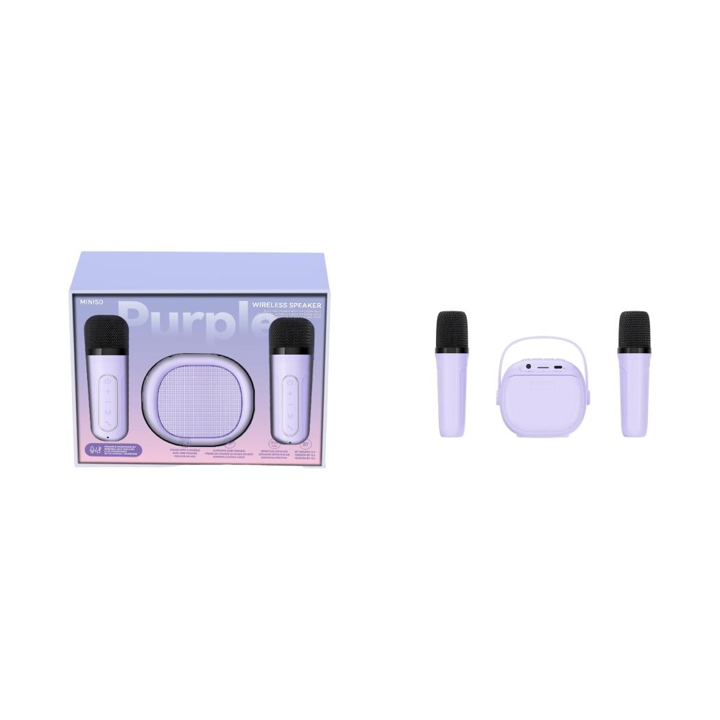 See kaunis lillakas juhtmevaba kõlarikomplekt toob lõbu igasse tuppa! Komplekti kuuluvad kaks mikrofoni ja kompaktne Bluetooth-kõlar, et saaksid pidada karaokeõhtuid, teha esitlusi või lihtsalt nautida kvaliteetset muusikat. 🎶✨